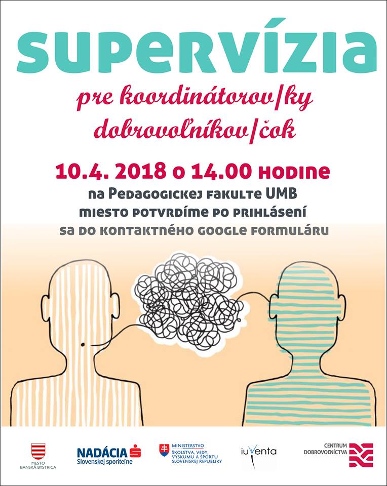 Koordinujete dobrovoľníkov a dobrovoľníčky a potrebujete vyvetrať hlavu a utriasť si myšlienky? Máme tu jeden horúci, aprílový termín SUPERVÍZIE pre koordinátorov a koordinátorky. Stačí vyplniť online prihlášku https://goo.gl/forms/GXQPVEUc7bX3ZJPK2 a vidíme sa !